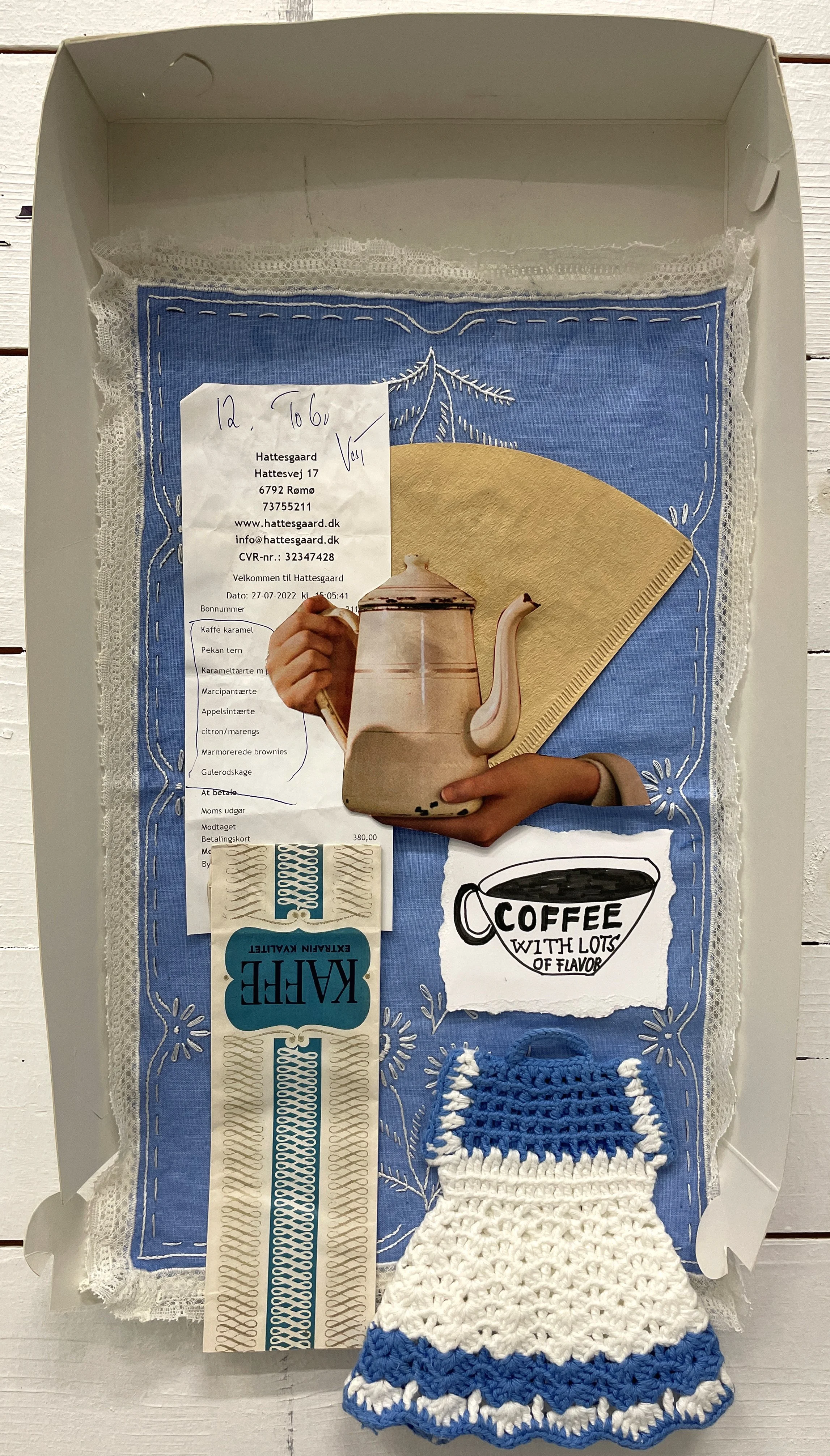 Coffee at Hattesgaard / Collage on cake box , texile / 49 x 27 cm / 2025